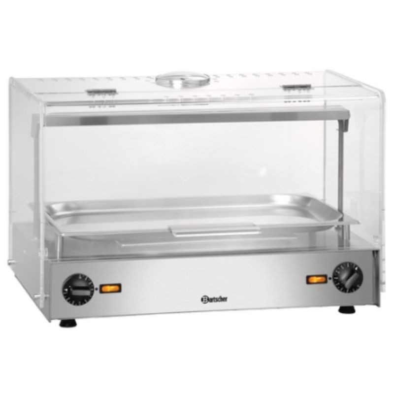 Four-sided glass display case to keep prepared foods warm. 3 fixed chrome shelves to display pies, pastries, and other snacks. Adjustable temperature from 30 to 90°C, curved glass front to showcase a maximum of products, and sliding rear doors for easy access. Features internal LED lighting.