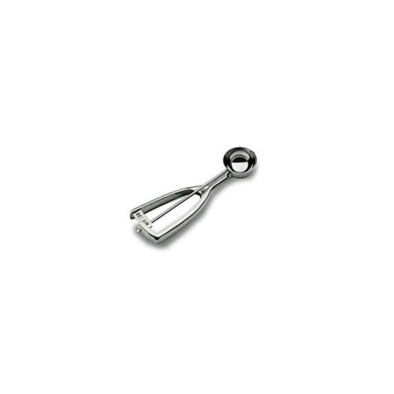 This stainless steel scoop can be used with all kinds of foods. It features a spring handle for easy and quick use.