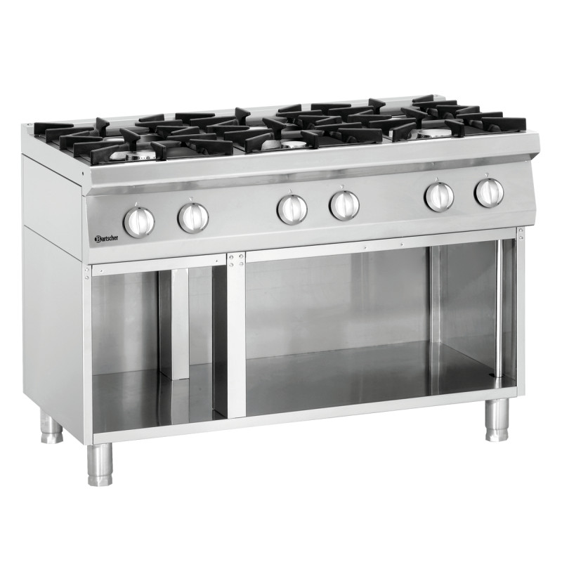 Šporák z nerezovej ocele 18/10 má 4 živé ohne na plyn s pilotmi a dvojitými korunnými horákmi na plyn.
